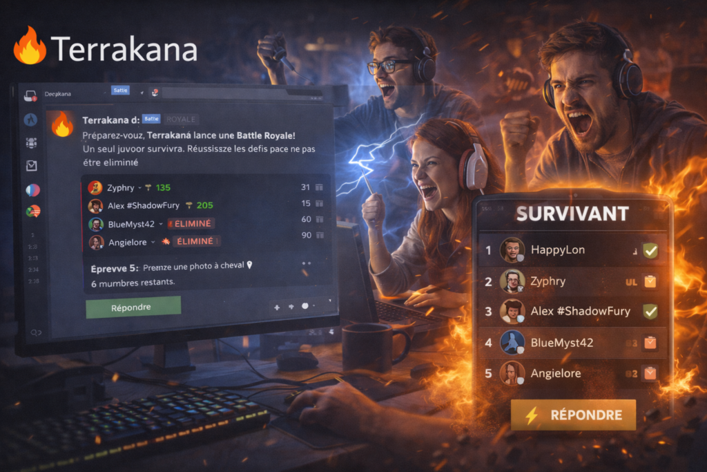 Terrakana🔥injecte une dose d’adrénaline directement dans vos salons textuels. Notre bot propose une expérience asynchrone unique : les défis sont lancés, et vos membres y répondent quand ils le souhaitent, sans perturber leur emploi du temps. Pour les serveurs qui aiment l’intensité, le mode Battle Royale est l’outil de rétention ultime : à la fin de chaque épreuve, les moins performants sont éliminés jusqu’à ce qu’il ne reste plus qu’un seul survivant.